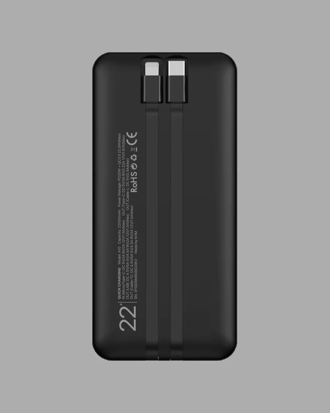 This KHM Power Bank is engineered for Super Fast and reliable portable charging. It features a high-capacity 22000mAh battery, providing extended power for multiple device recharges. The 22.5 Watt (22.5W) output supports rapid charging standards like Power Delivery (PD), ensuring your compatible smartphones and tablets are powered up quickly and efficiently. It’s the perfect blend of capacity and speed for heavy daily use and travel.