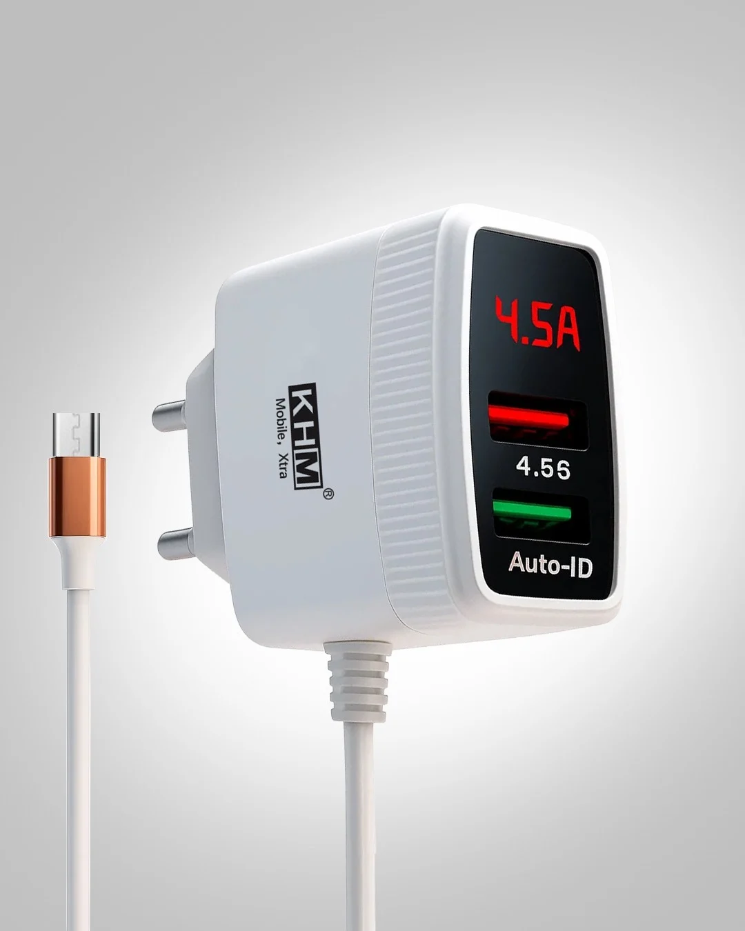 The KHM Charger M-99 offers Super Fast Charging capability and is equipped with a functional LCD Display Charger for real-time monitoring of voltage and charging status. It features dual charging with 2 USB Sockets and supports a powerful 4.5V output for efficient power delivery. Safety is prioritized through Over Charge Protection and Auto ID Cut Off Safety, intelligently preserving the battery life of your connected devices.